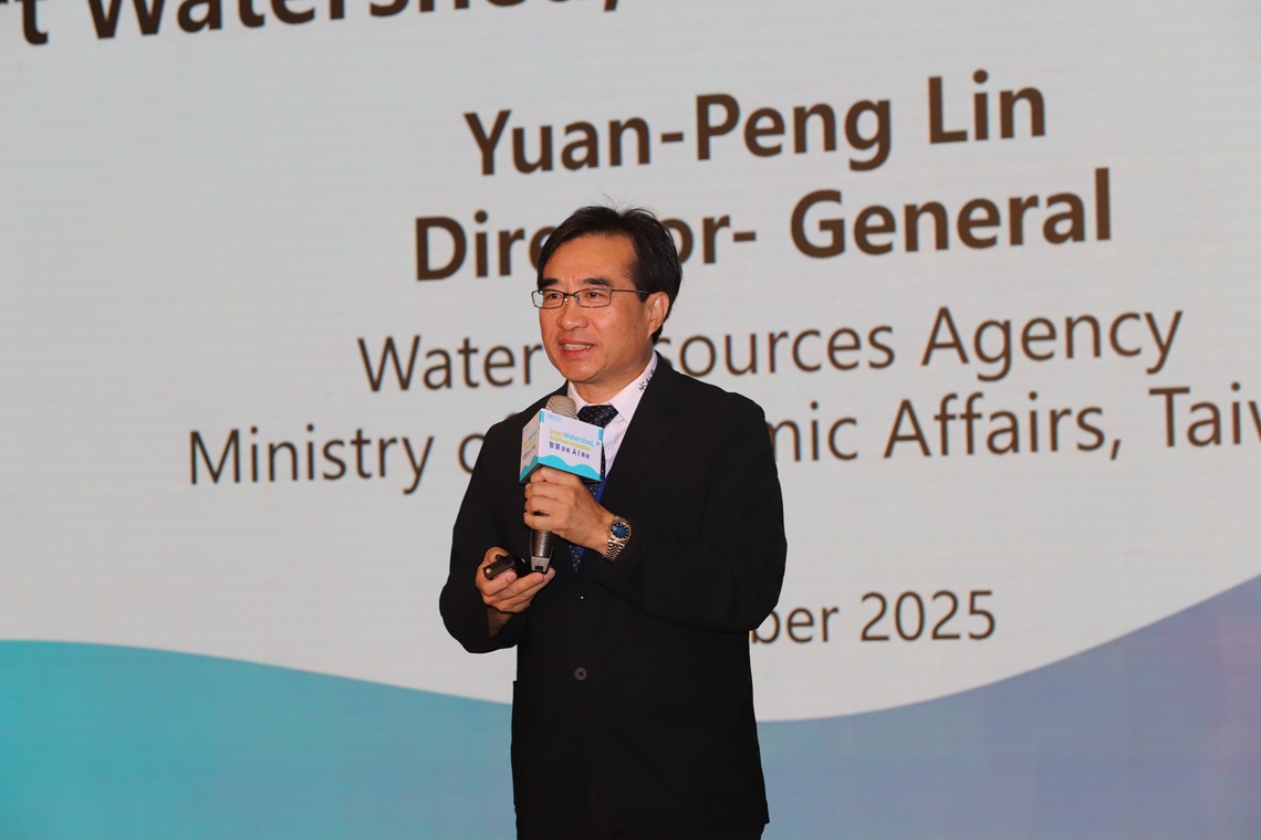 隨後,水利署林元鵬署長以「智慧流域.AI領航」為題進行引言。他指出,水資源既是社會永續的根本,也是產業發展的命脈。近年來,極端氣候頻仍,臺灣更面臨旱澇交替、水利基礎設施老化與用水需求成長的挑戰。今年數場颱風豪雨造成部分地區積淹水災情,更加劇流域水環境的衝擊。而面對臺灣未來人口老化、少子化、都市化及產業集中的社會結構,水資源管理、流域治理、防災應變刻正順應情勢與時俱進,以人為本並結合各項智慧技術,落實推動水利數位轉型策略,並透過循證治理原則結合系統性規劃推動,讓水利業務更精準即時且契合人民需求。