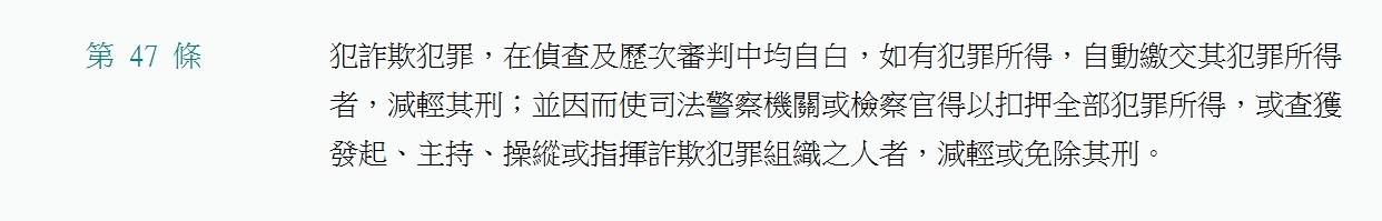 (三)本條例為打擊詐欺犯罪,明定第43條、第44條加重詐欺罪名,並提高其法定刑。第47條復規定對於合於本條要件之行為人減免其刑,有緩和上開第43條、第44條重刑規定之寬嚴併濟作用,解釋上自不宜過苛。