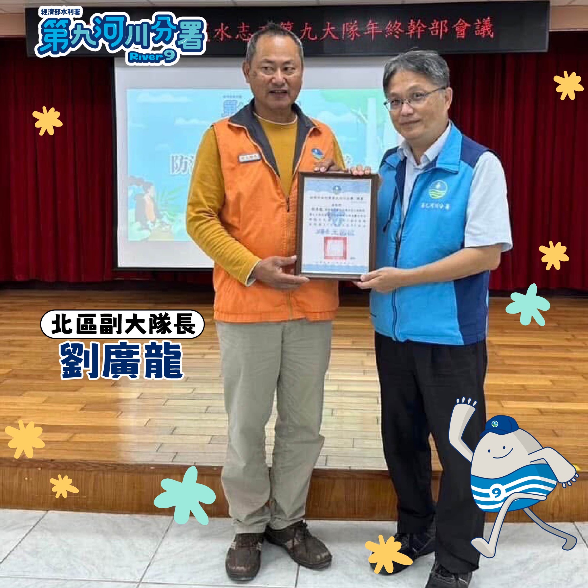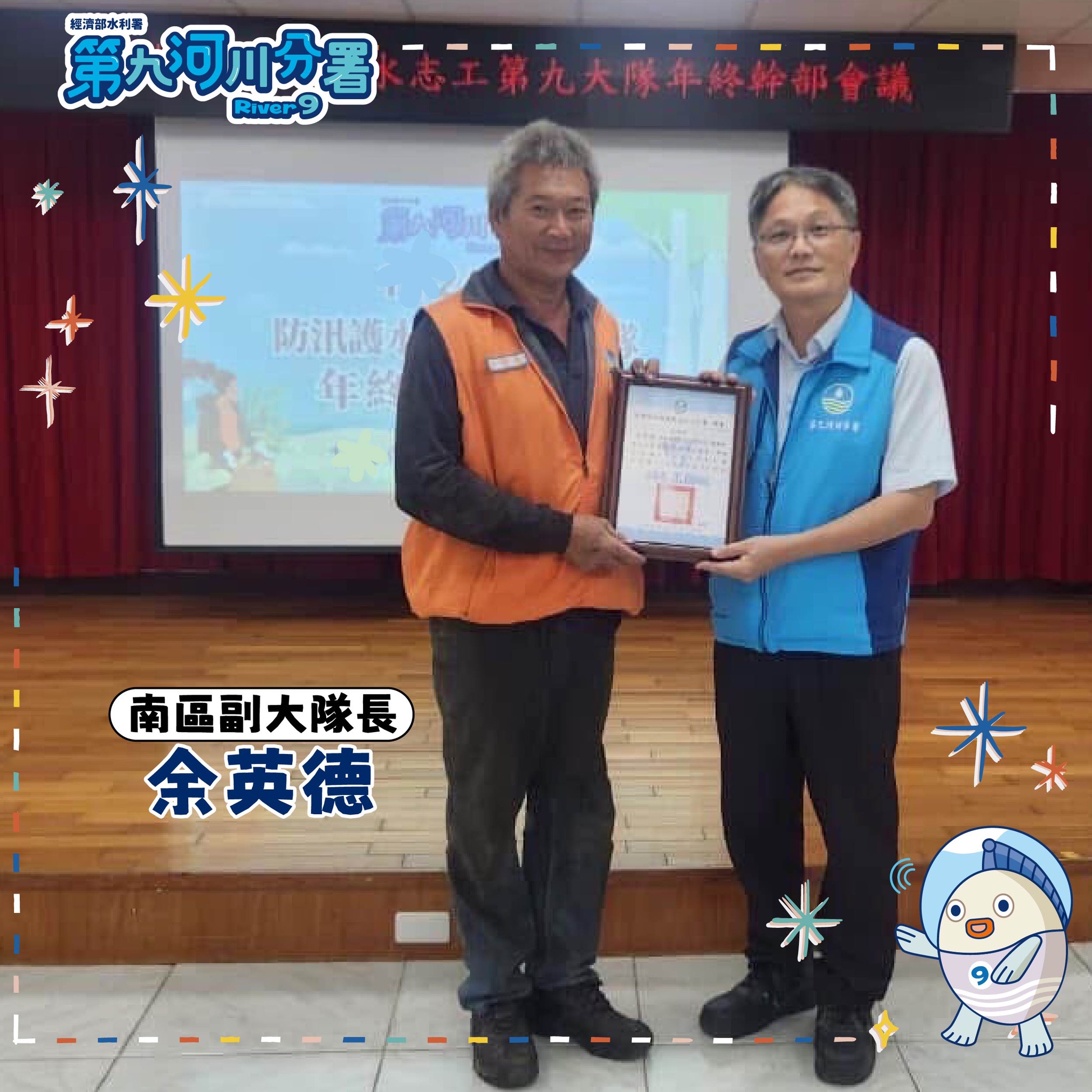 本分署特別感謝兩位志工領袖-劉廣龍及余英德副大隊長,他們總是默默奉獻,以堅定的責任感與熱忱服務精神,保護著我們的河川及家園!